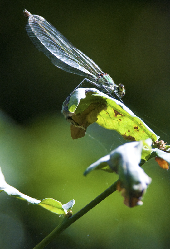 A little further on, I thought I found something exciting in the form of a biggish, pale greenish damsel. But a closer look proved it to be a female Banded Demoiselle, one that I guess is getting on a bit as her wings and body were both much paler than is usual in this species.