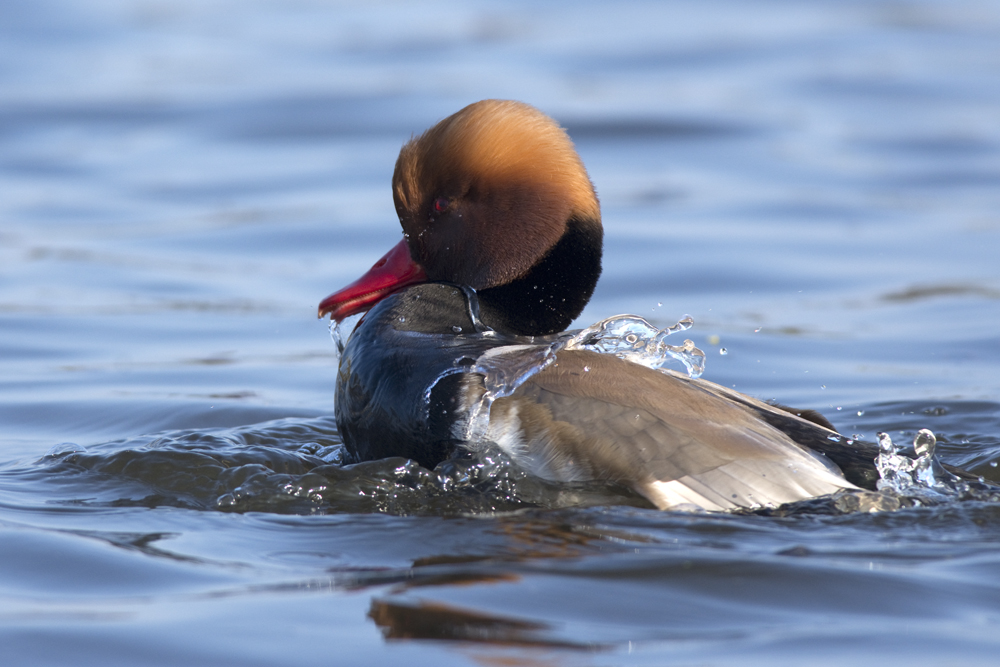 It was not just the ducks feeling frisky. I am not sure exactly what this Coot hoped to achieve but the Red-crested Pochard was NOT into it. After it got away it spent several minutes bathing.